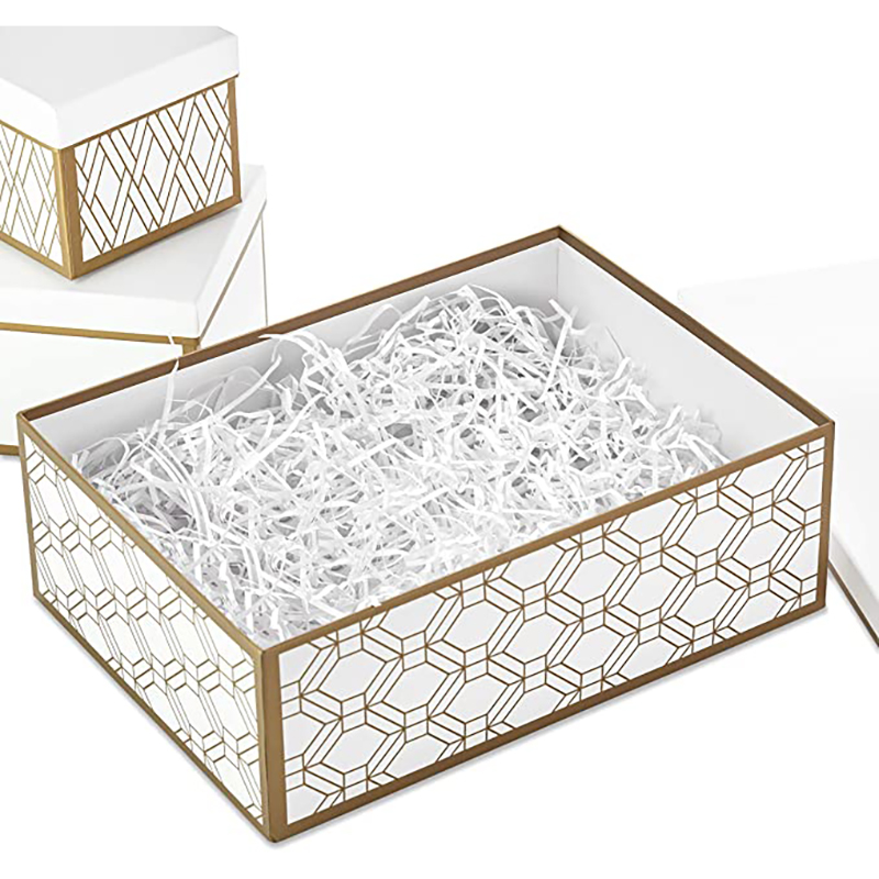 large și cutii mici prezintă modele geometrice de aur și alb, în timp ce cutia medie este albă cu margini de aur. Toate căsuțele cadou cuibărite vin cu capace albe cu margini de aur.